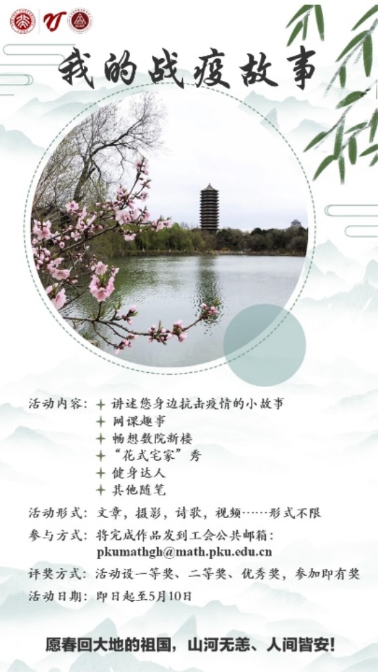 2020,在猝不及防间,整个中国迎来了这场突如其来的危机。在2020年1月底到2020年4月初的两个多月里,想必对于每个人都是特殊的。每天打开手机,那一串串牵挂人心的数据,那一个个勇往无前的身影,无不令人百感交集。这场突如其来的新型冠状病毒感染肺炎疫情,给学院的教职工的工作和生活带来哪些改变?在这场与时间赛跑、与病毒赛跑的阻击战中,学院的教职工有哪些切身的感受呢?为此,在这个春暖花开的时节,数学学院工会开展“我的战疫故事”主题活动,邀请教职工分享在新型冠状病毒感染的肺炎疫情发生后,他们在这段“特殊”的日子里的战“疫”故事。活动以群发邮件和发布活动海报的形式向全院老师征集。