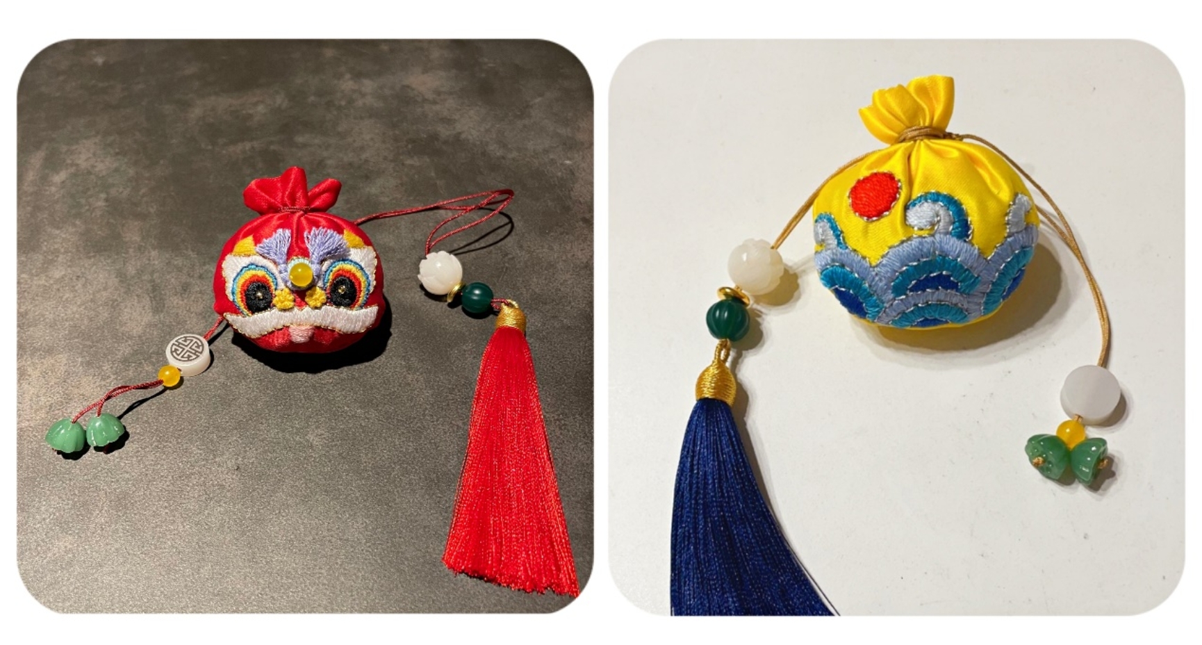 在轻声细语的研讨中,在芊芊玉手的劳作中,在五彩丝线的游走中,缎面上的图案渐渐显出了端倪,形成了一个个生动的纹样:有生机勃发的瑞狮,有层叠有致的水波,有安详灵动的神鹿,有恬淡的梅和清雅的荷。每种图案无一不蕴含了吉祥、和善、平安、健康的心意。在刺绣,剪裁,缝纫等工序后,再配以精巧的配件和灵动的流苏,成品的香囊就更加令人心折。