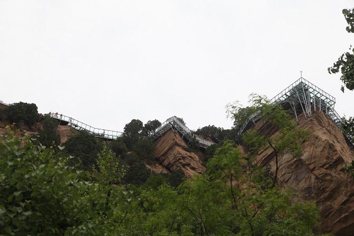 穿过索道上站,绕行谷间稳座的太公石一路上行,跨越激流涡旋而下的母子潭,仰望谷中气势最盛的乐仙瀑后,不少老师抵达了山顶的玻璃栈道。栈道建在景区最高峰“九重天”,宛如青蛇般悬挂在崖壁北侧。临渊而立似脚踩树尖,于半空漫步云端,远望山岚重叠,天桥飞架,确是独特的巅峰体验。