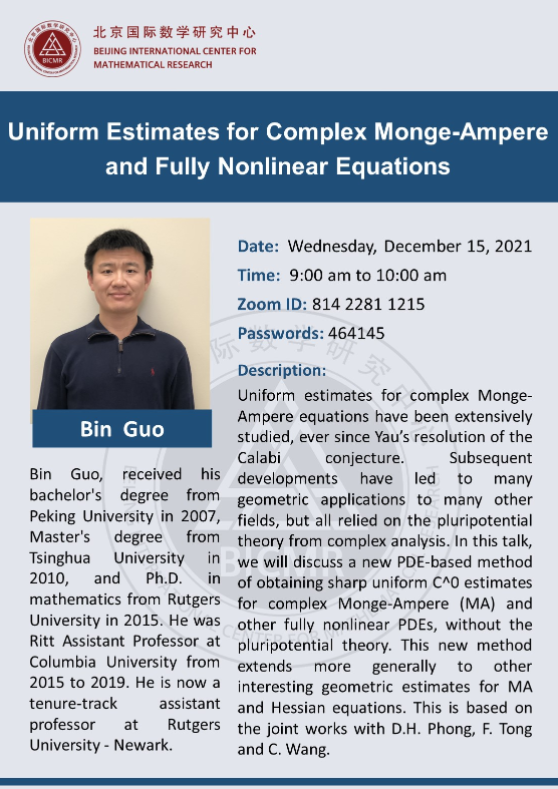 Bin Guo, received his bachelor's degree from Peking University in 2007, Master's degree from Tsinghua University in 2010, and Ph.D. in mathematics from Rutgers University in 2015. He was Ritt Assistant Professor at Columbia University from 2015 to 2019. He is now a tenure-track assistant professor at Rutgers University - Newark.