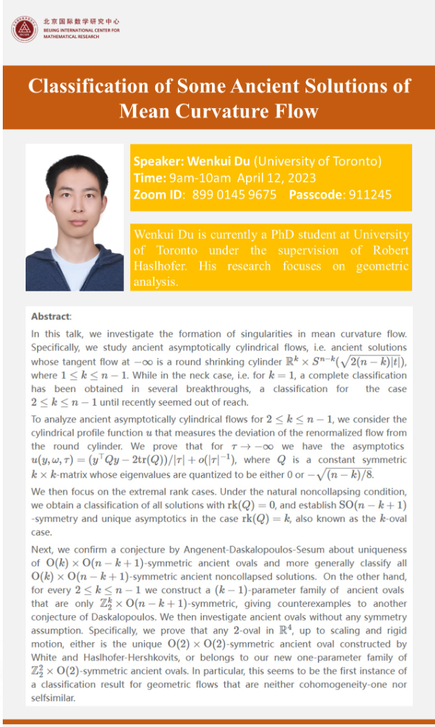 Speaker: Wenkui Du is currently a PhD student at University of Toronto under the supervision of Robert Haslhofer. His research focuses on geometric analysis.
