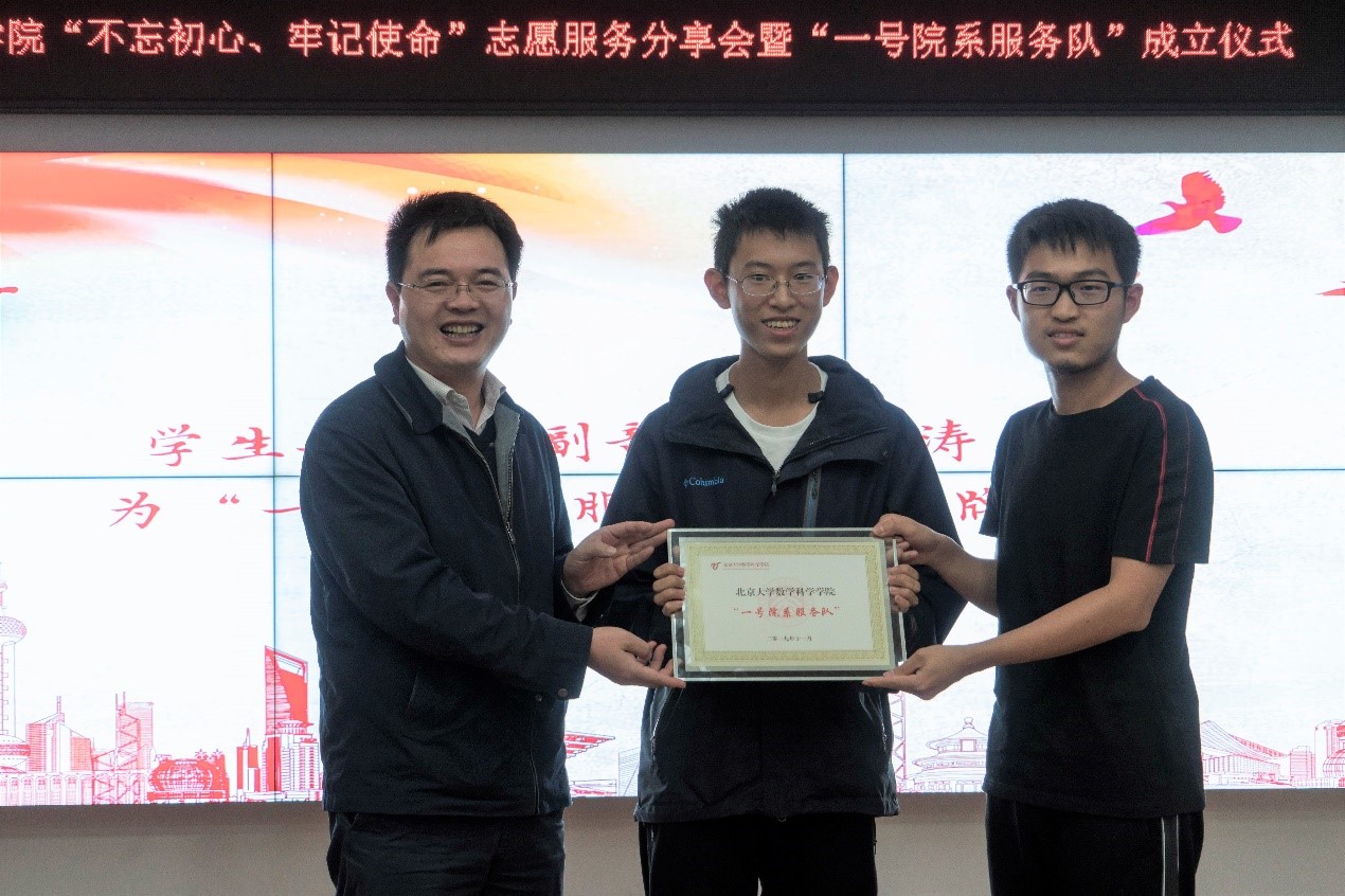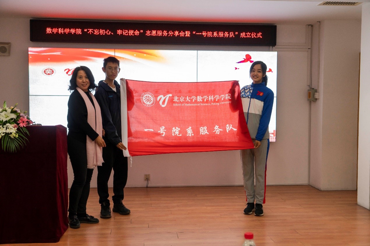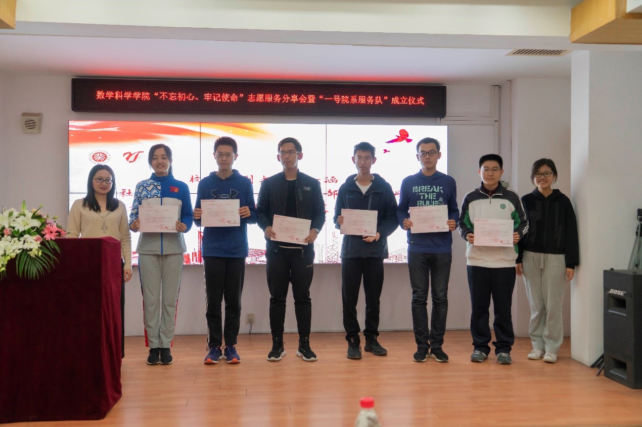 “不忘初心、牢记使命”主题志愿服务分享会暨“一号院系服务队”成立仪式在理科一号楼1560室举行。数学科学学院院长陈大岳、教务长办公室主任王小玥、学生工作部副部长王欣涛、校团委副书记王一涵、校团委社会实践部部长李晓丹、学院团委书记冯美娜、团委副书记张力今、崔孟龙出席。分享会由学院党委副书记董子静主持。