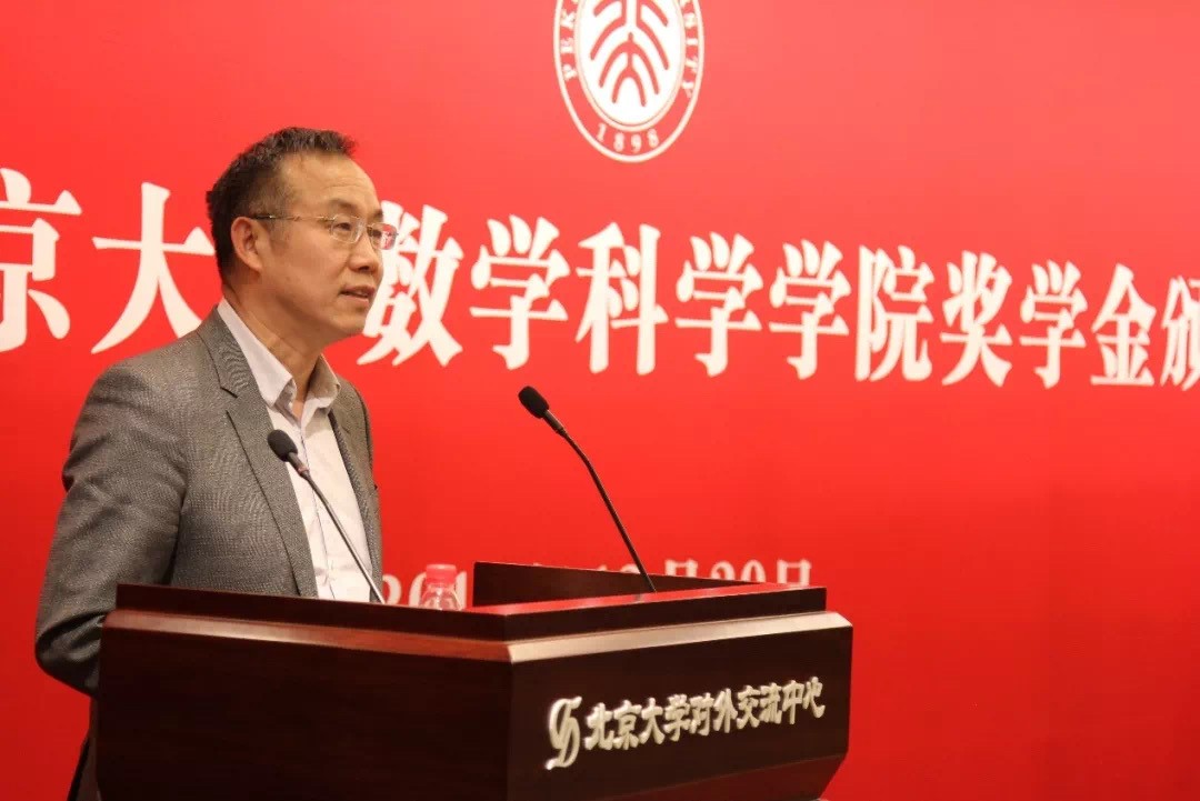 1999级本科生、2003级博士生院友邓柯先生致辞,他讲述了99本奖学金的起源,表示北大人的使命与情怀是深入骨髓的,期望同学们无论何时何地都能牢记北大精神,认真学术,不断努力,并将这种精神不断传承下去,带着使命感与责任感发展数学学科,为国家的发展与民族的振兴做出贡献。