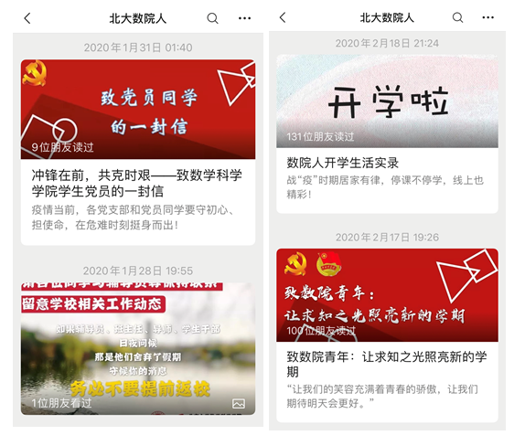 人”、“数院学生会”、“数院研究生会”三个公众平台做好疫情防控思想引领和科普宣传工作,以“防疫数递”、“防疫科普”、“战疫有我”、“数研防疫”四个特别栏目,推进党团指导、信息畅通、科普防疫、学研督导,1月23日至今各团学组织推出党团致信、防疫科普、教学选课等相关推送27篇。学生会组织学生进行线上教学调研,经讲授老师同意在bilibili网站整合“数学一小时”学术资源,响应停课不停学的倡导。此外,通过学工办集中组织和动员党团班力量,开展元宵佳节征集活动、主题党日、主题团日和主题班团活动,有效凝聚在湖北、在学校和在全国各地的同学,在疫情防控的特殊时期凝聚起学院师生的温暖情谊和必胜信心。