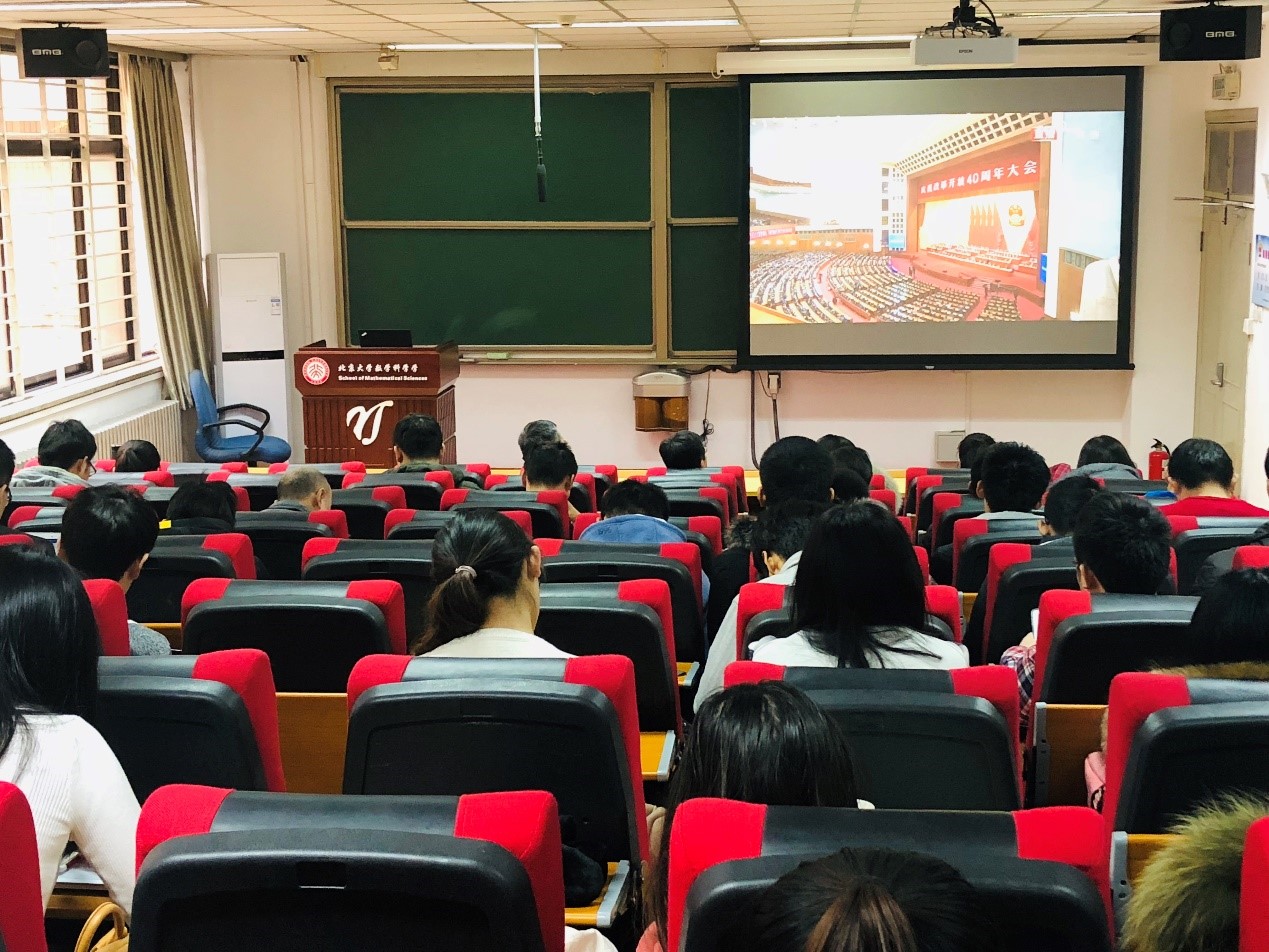2018年12月18日上午10时,庆祝改革开放40周年大会在人民大会堂隆重举行。中共中央总书记、国家主席、中央军委主席习近平同志发表重要讲话。数学科学学院组织师生在理科一号楼1114室集体观看了大会直播。院长陈大岳、副院长李若、党委副书记孙赵君和学院百余名师生一起观看大会直播,共同回顾改革开放40年的光辉历程。