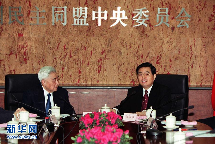 2002年12月24日,胡锦涛同志走访中国民主同盟中央委员会时与丁石孙同志在一起。 新华社记者 刘建生 摄